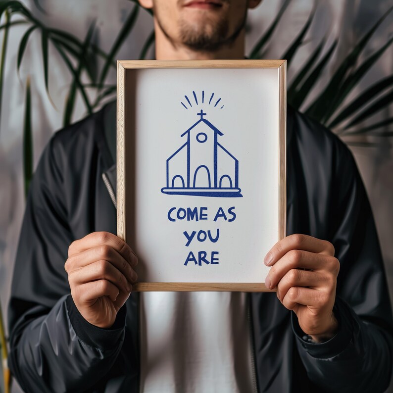 Arte mural de invitación a la iglesia: póster cristiano «Ven como eres»