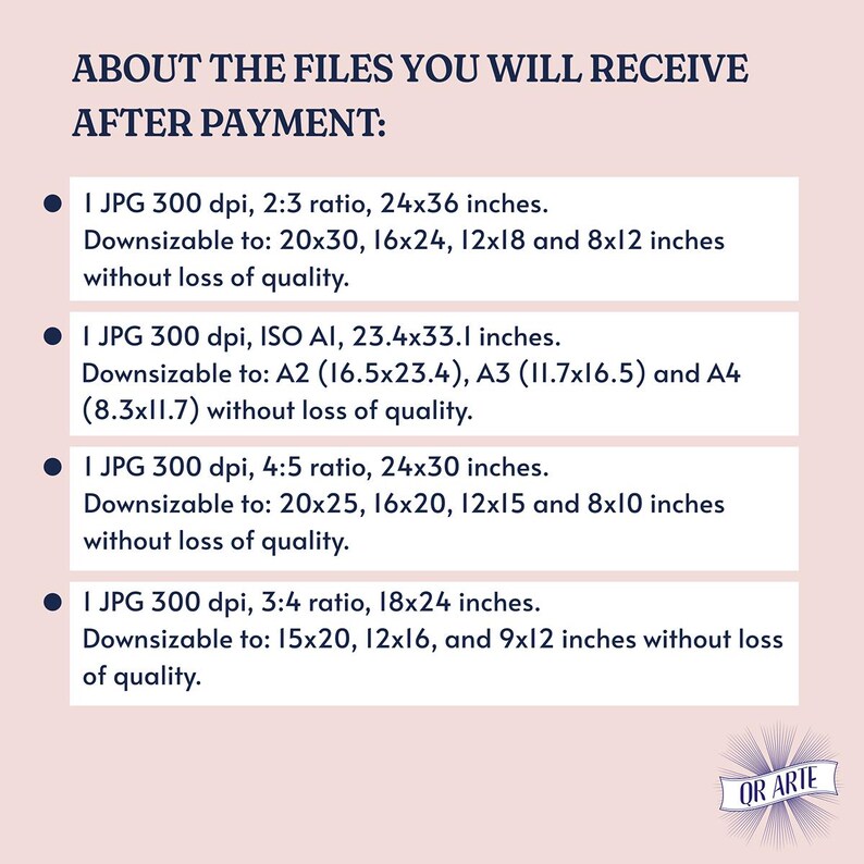 ☀︎ 1 archivo JPG de 300 ppp con relación de aspecto 3:4 y tamaño 45 x 60 cm (18 x 24 pulgadas). Esta relación también se puede imprimir en los siguientes tamaños sin necesidad de recortar la imagen y sin pérdida de calidad: