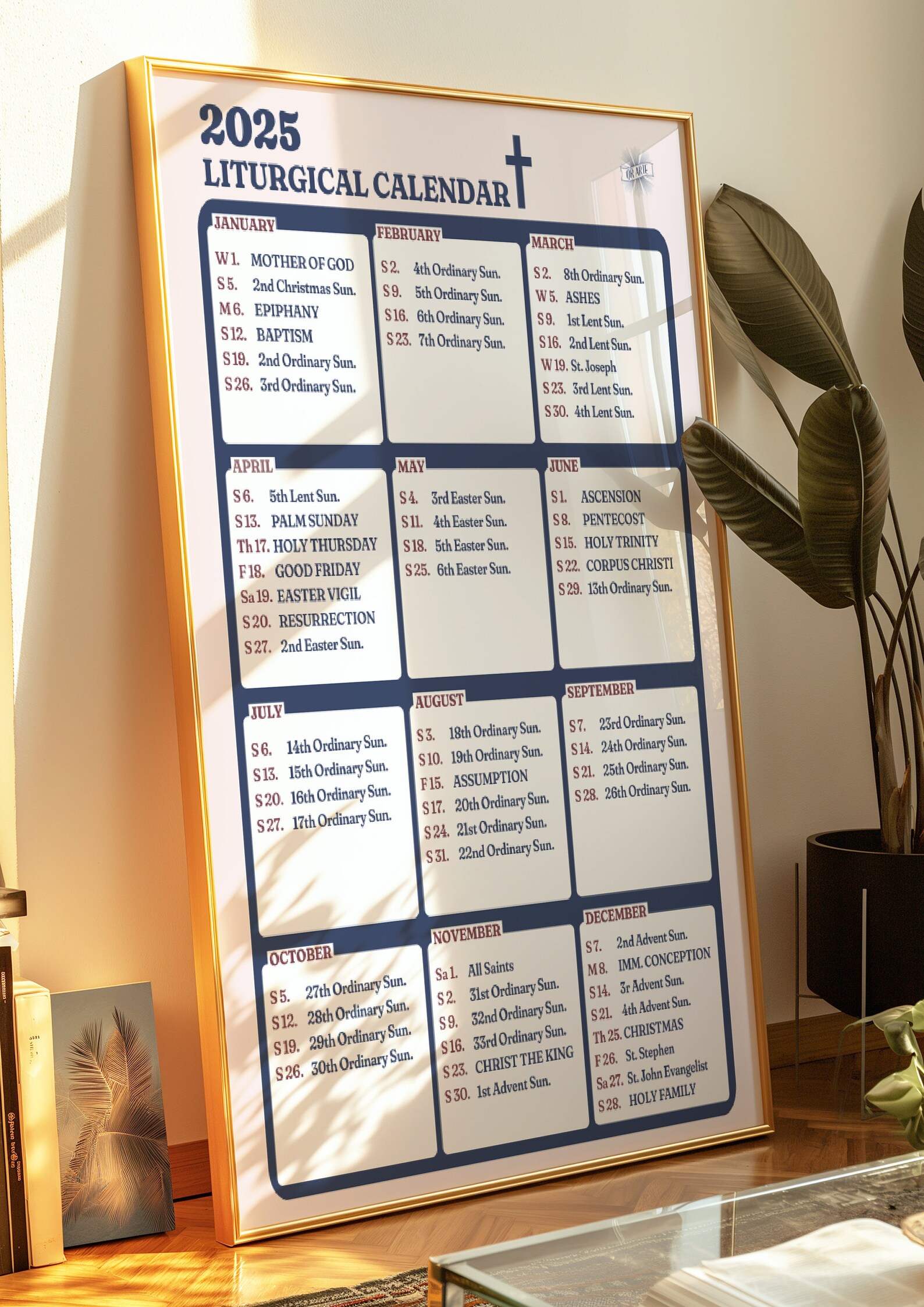 👐🏻 ¡Este calendario católico imprimible resume los días principales del próximo año cristiano 2025! Recuerda los momentos más importantes de la vida de Jesús con este póster católico que puedes usar para decorar tu aula, tu casa o tu escuela parroquial. Desde los últimos días de Navidad hasta los últimos días de Adviento, podrás orientarte en el tiempo gracias a la información de este calendario. ¡Espero que te sea útil y te guste!