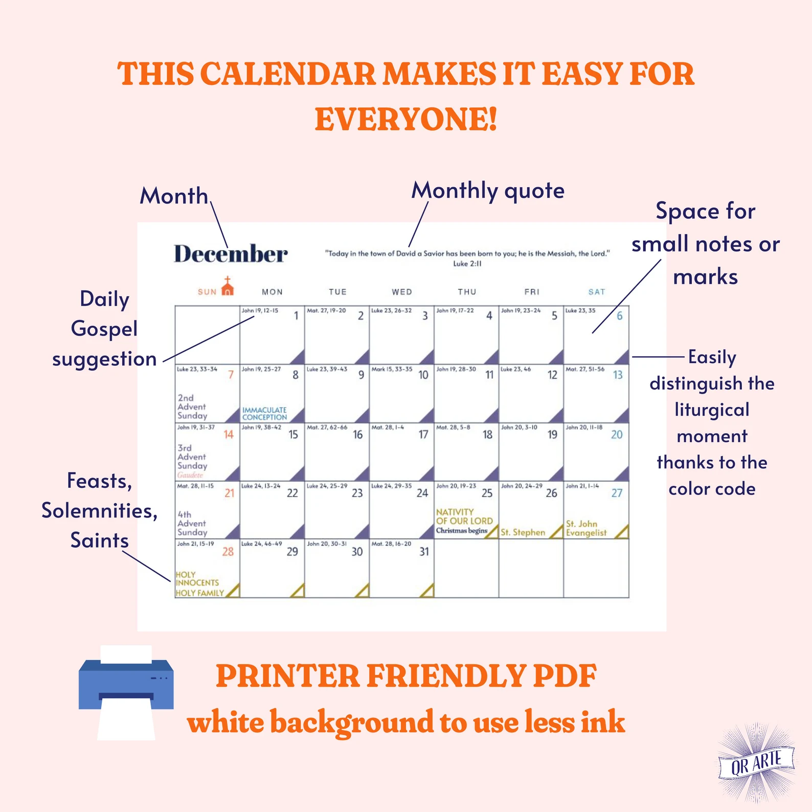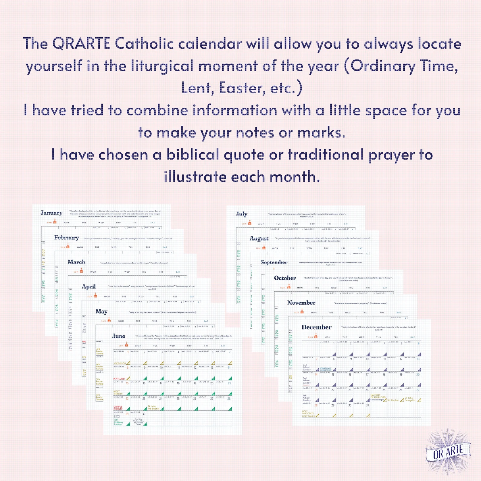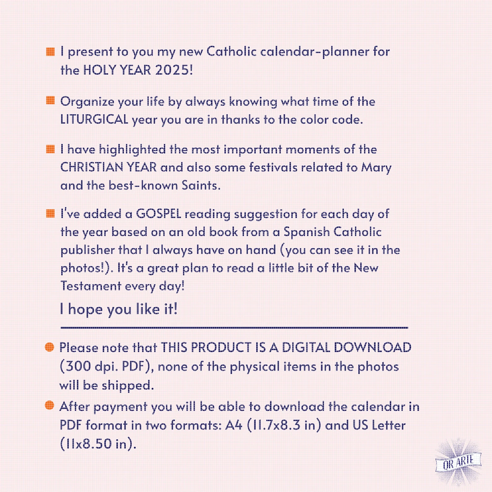 Calendario católico imprimible para el Año Santo 2025. Una página por mes. ¡Mantén siempre el momento litúrgico del año cristiano! Cuelga o encuaderna las trece páginas de este calendario y disfruta sabiendo si estás en Adviento, Tiempo Ordinario, Cuaresma… Recuerda los eventos más importantes del cristianismo. He añadido una cita del Evangelio para cada día del año, tomada del libro antiguo que puedes ver en las fotos. Es una forma de leer el Nuevo Testamento a diario, meditar en él y fortalecer tu fe.