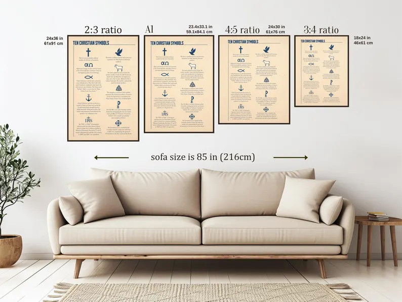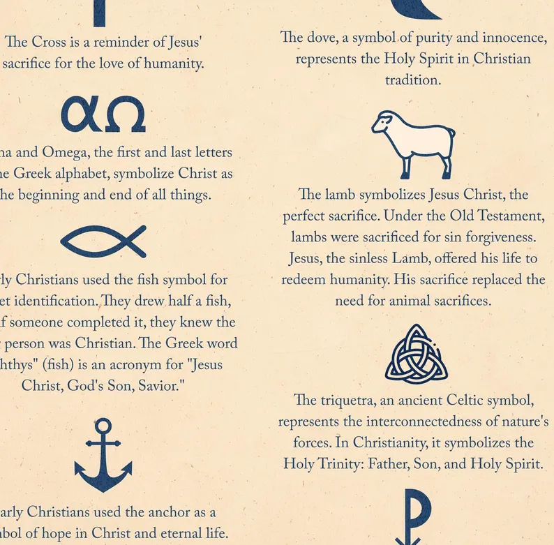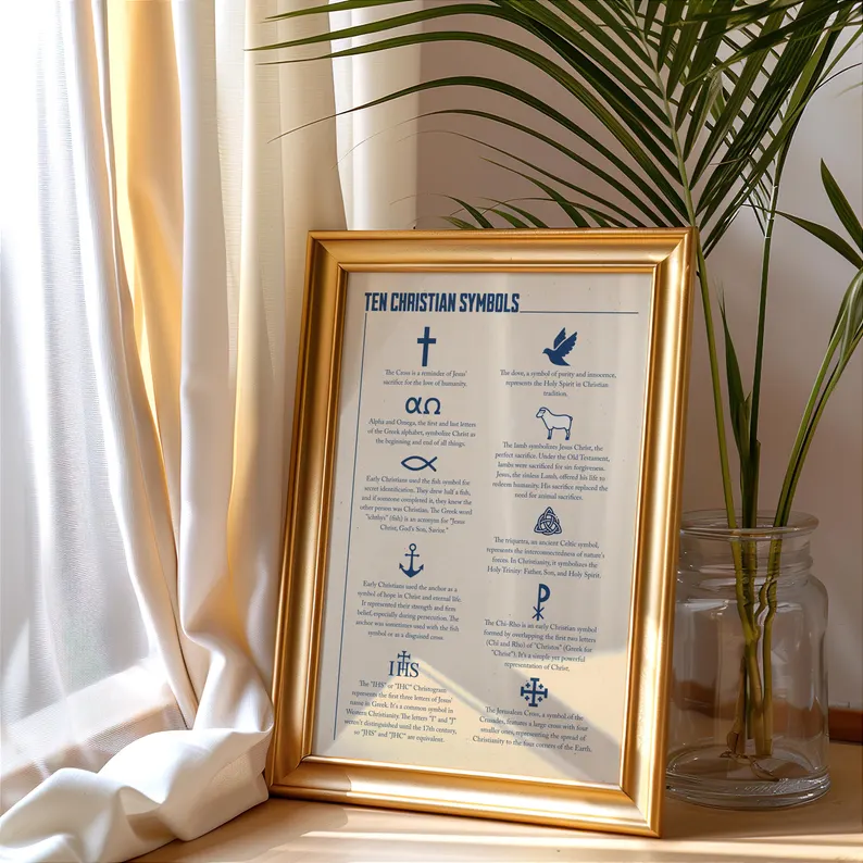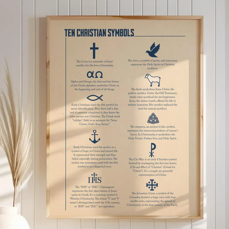 ✐ En este póster educativo he recopilado diez de los símbolos históricos del cristianismo. Comprender este simbolismo implica comprender buena parte de la historia de nuestra religión, de los seguidores de Jesús y su devoción, imaginación y buenas intenciones. Perfecto para catecúmenos, escuelas dominicales o parroquias. También para quienes quieran decorar su pared con un toque de cultura religiosa general. La textura de la imagen imita el papel envejecido y las imperfecciones son intencionadas.