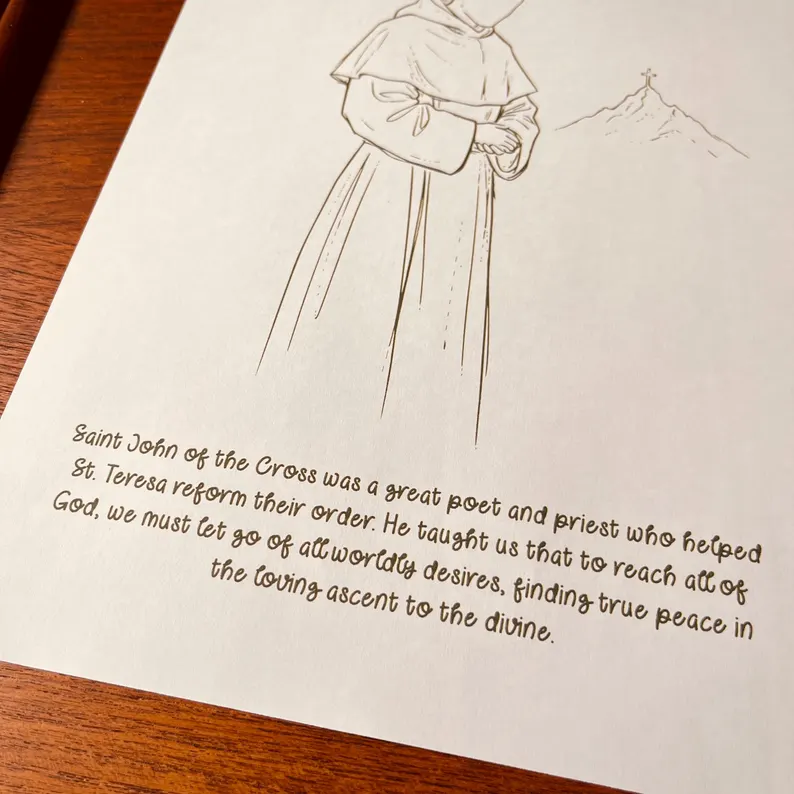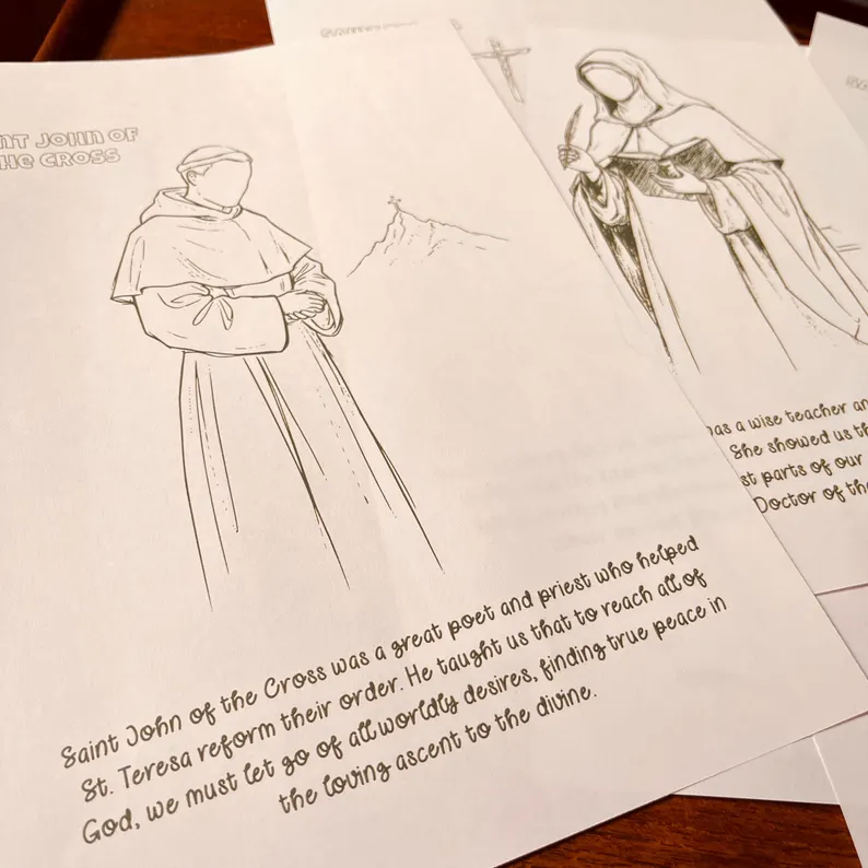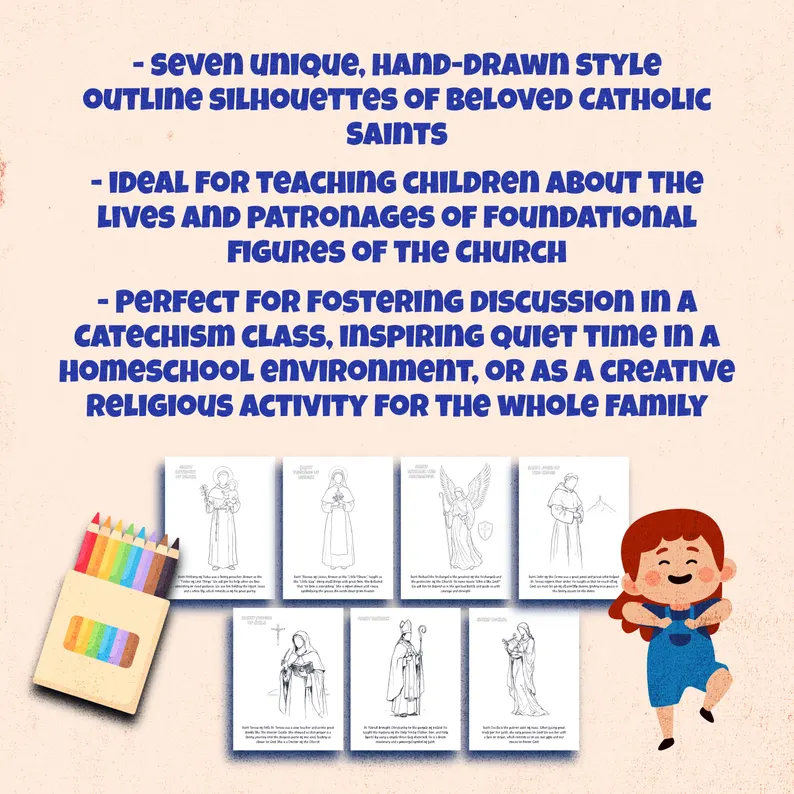 Este conjunto de dibujos digitales para colorear incluye siete siluetas únicas, dibujadas a mano, de santos católicos muy queridos. Este paquete es ideal para enseñar a los niños sobre la vida y el patronazgo de figuras fundamentales de la Iglesia, y también sirve como herramienta para la meditación y la disciplina espiritual en adultos.