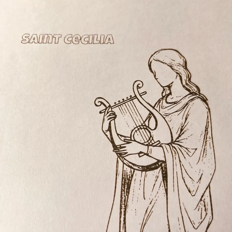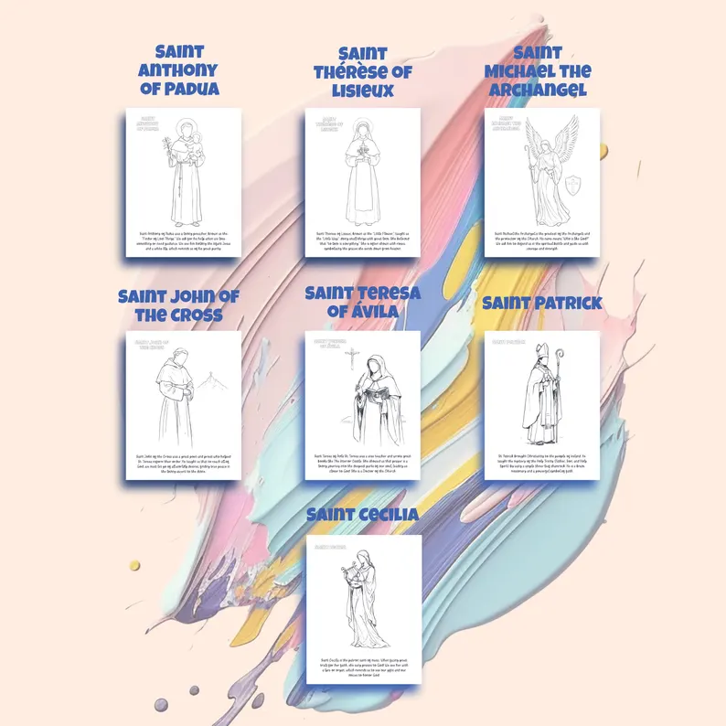 La colección incluye a San Antonio de Padua, Santa Cecilia, Santa Teresa de Lisieux, San Patricio, San Miguel Arcángel, Santa Teresa de Ávila y San Juan de la Cruz. Cada página presenta la figura del santo con un estilo de dibujo lineal limpio y sencillo, perfecto para colorear y reflexionar con atención.