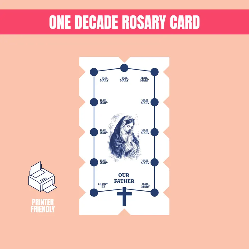 – 1 Tarjeta de una Década del Rosario: Una tarjeta imprimible que emula una sola década del Rosario, diseñada para facilitar su transporte.
