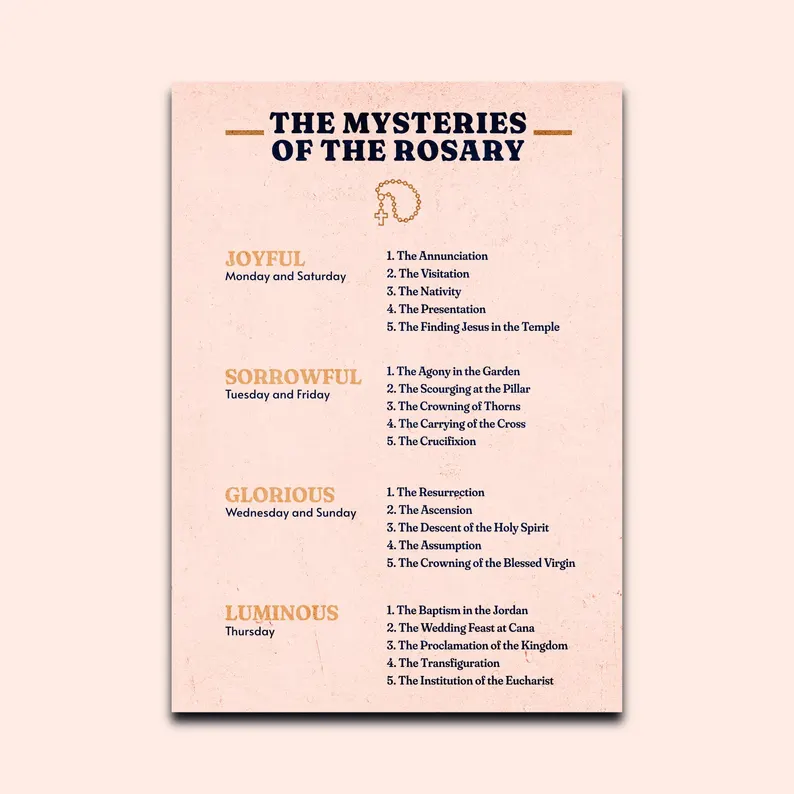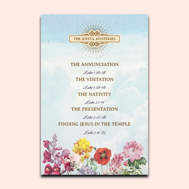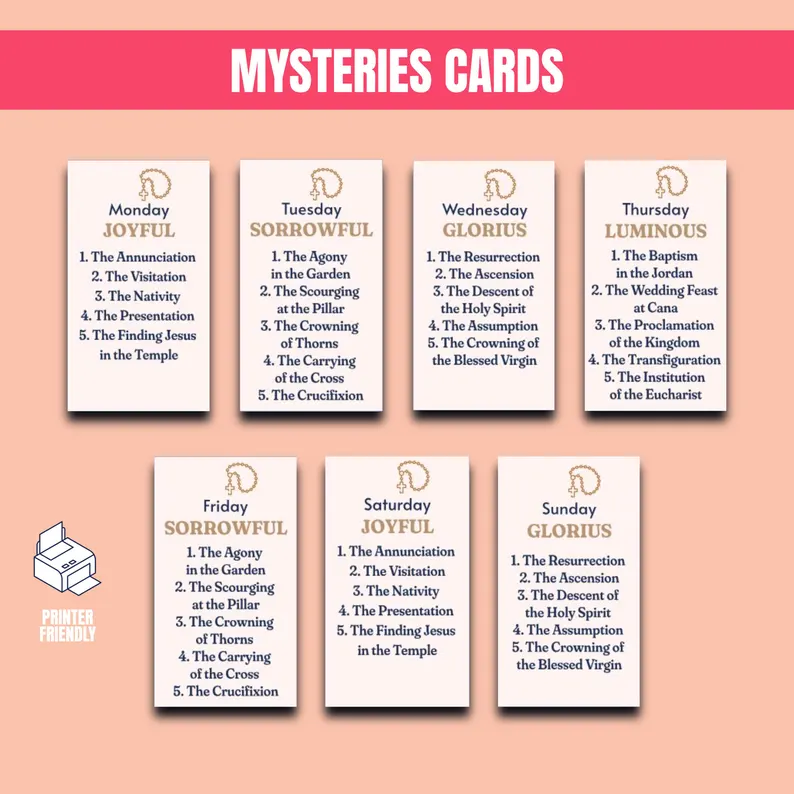 – 7 Tarjetas de Misterio: Tarjetas individuales imprimibles para rezar los Misterios del Rosario.
