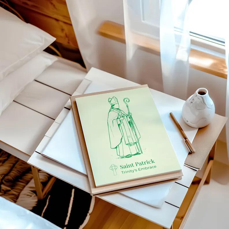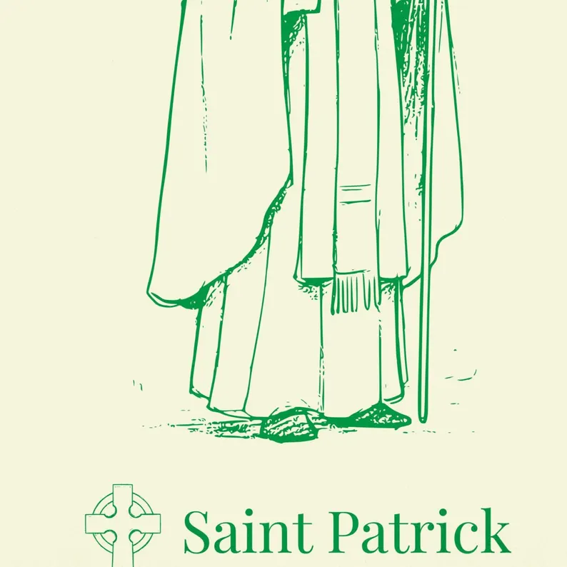 San Patricio es venerado por llevar el cristianismo al pueblo irlandés. Es famoso por usar el trébol para explicar la Santísima Trinidad: un símbolo sencillo y poderoso que representa al Padre, al Hijo y al Espíritu Santo. Este póster plasma esa enseñanza espiritual y el profundo legado de fe del santo.