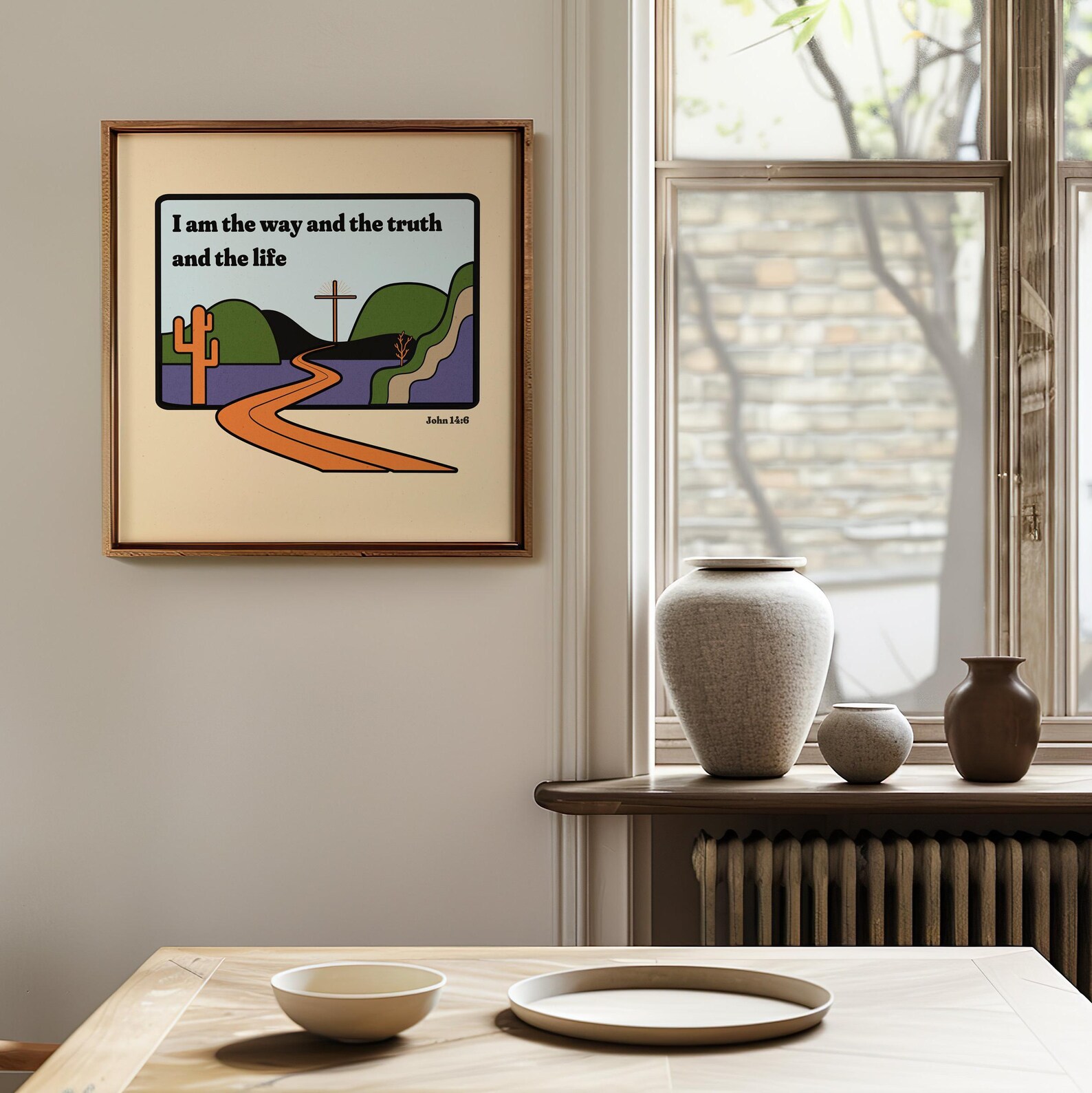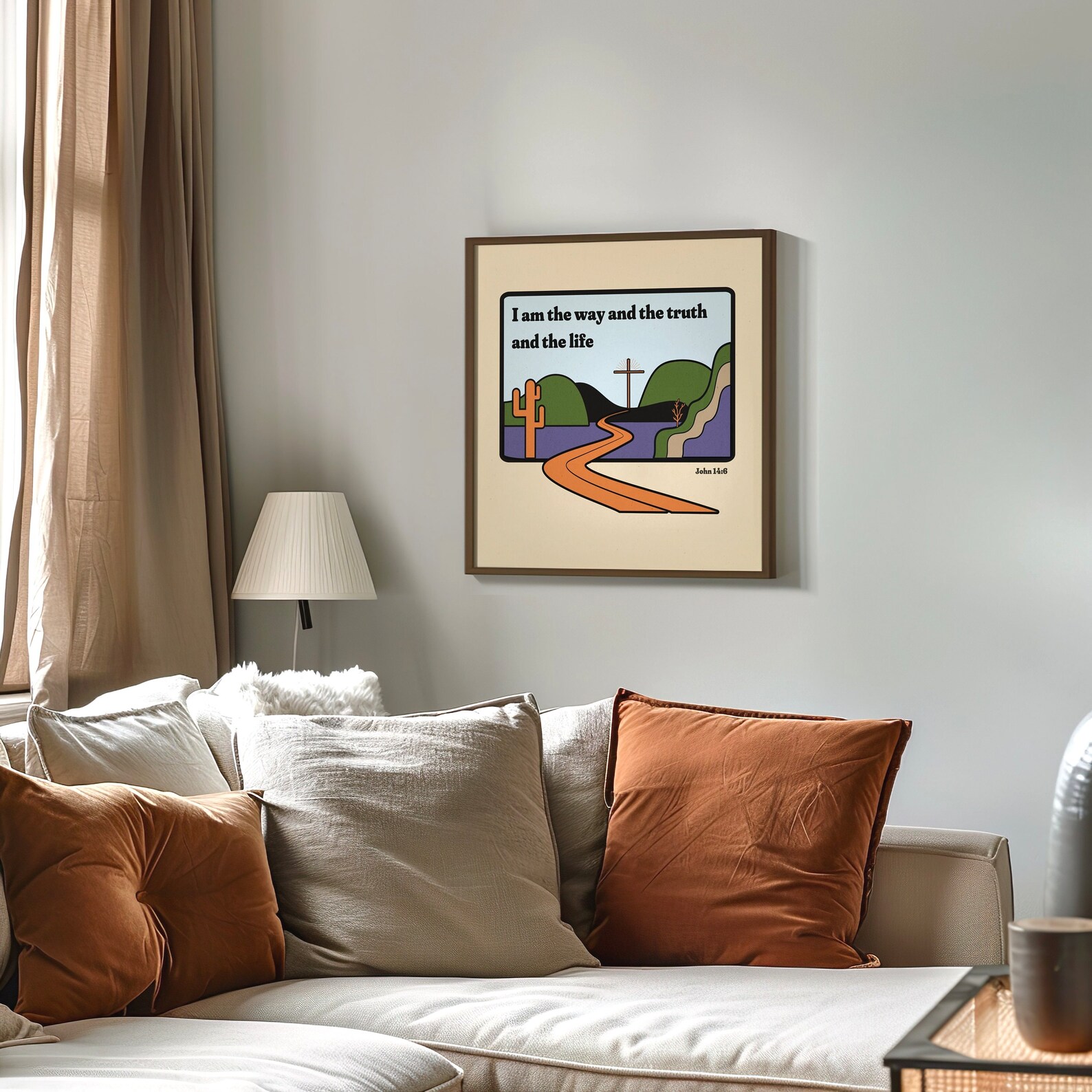 Un colorido póster cristiano en formato cuadrado para tu pared. «Yo soy el camino, la verdad y la vida», dijo Jesús. Decora tu habitación favorita con este póster que contiene una de las citas bíblicas más conmovedoras.