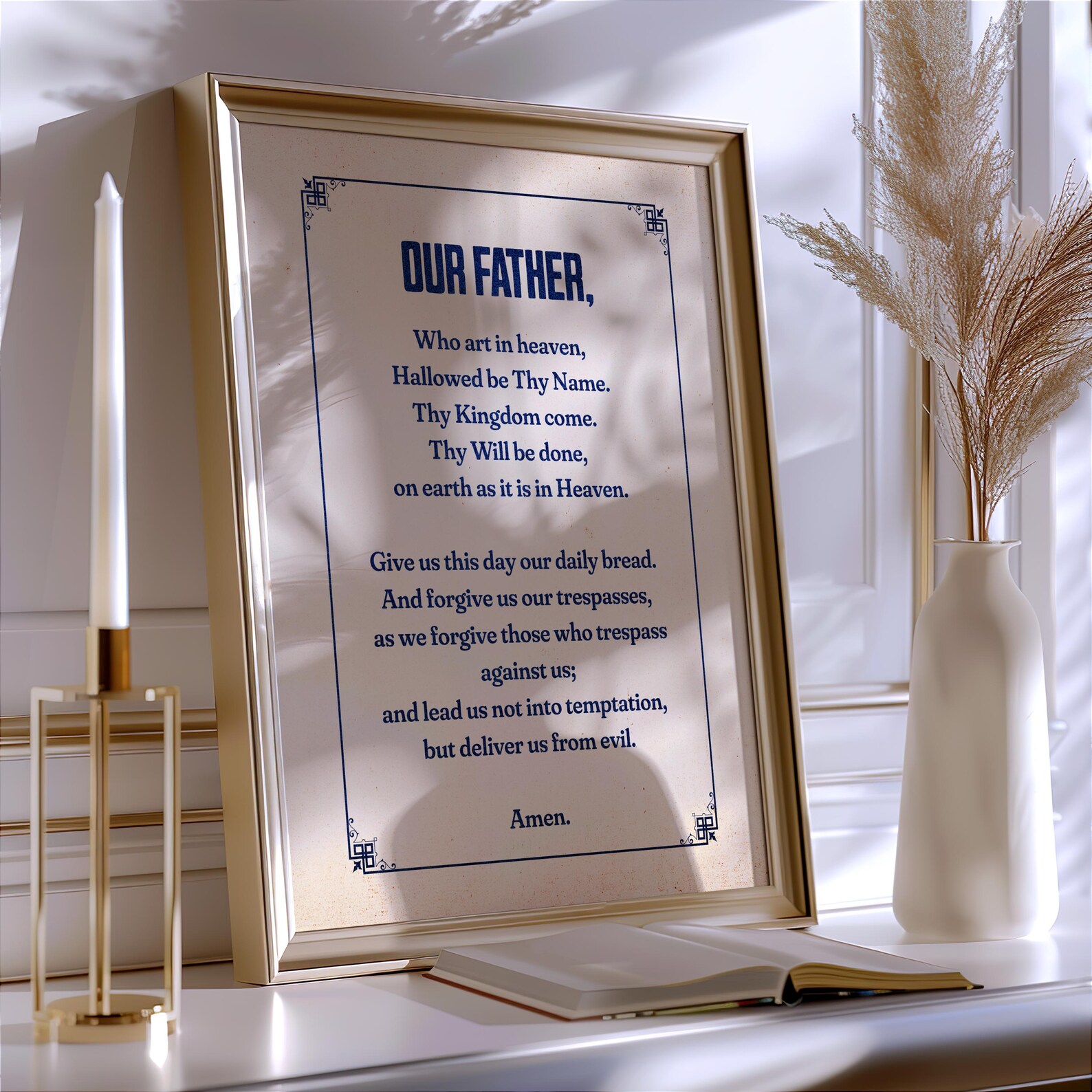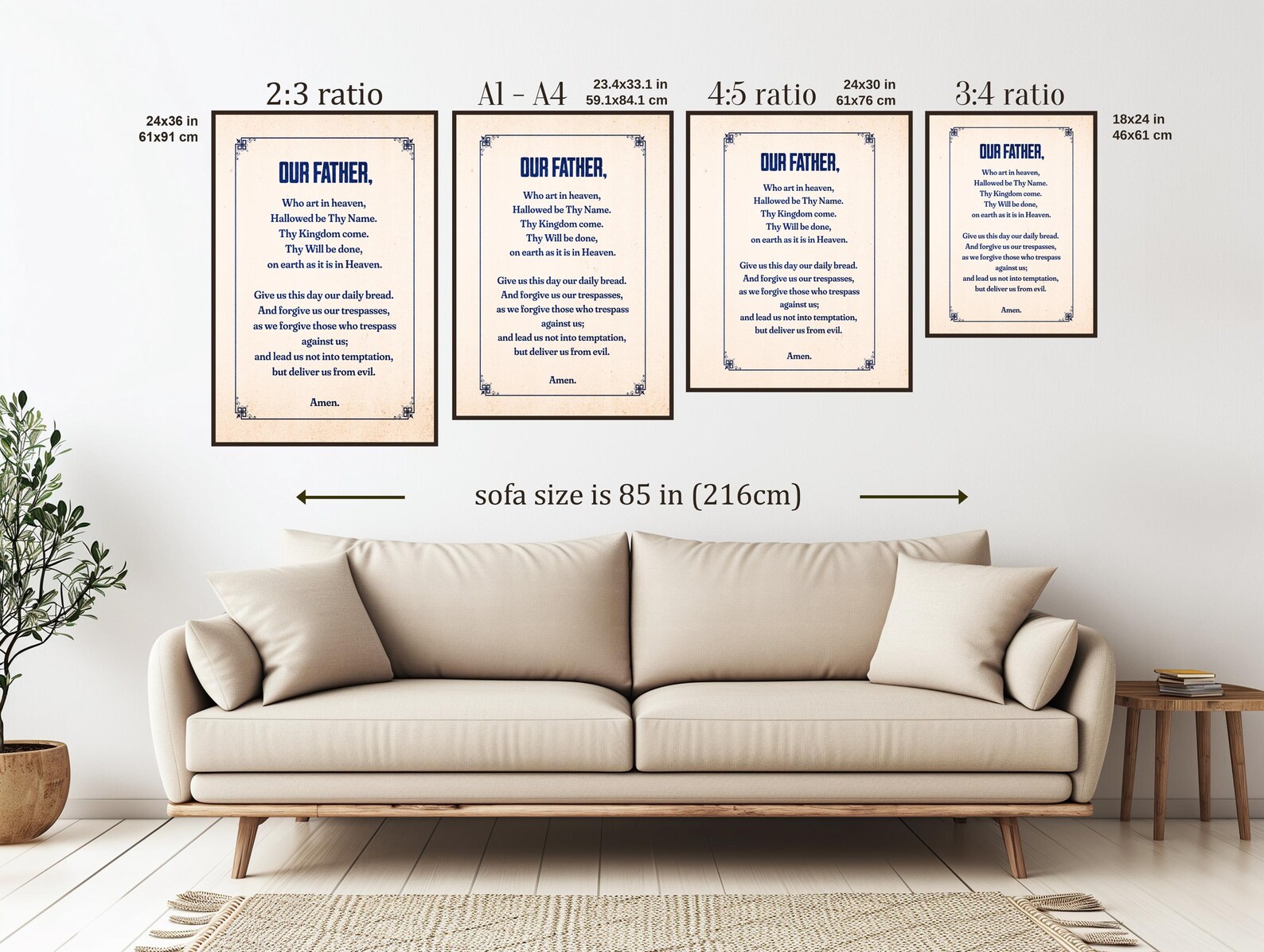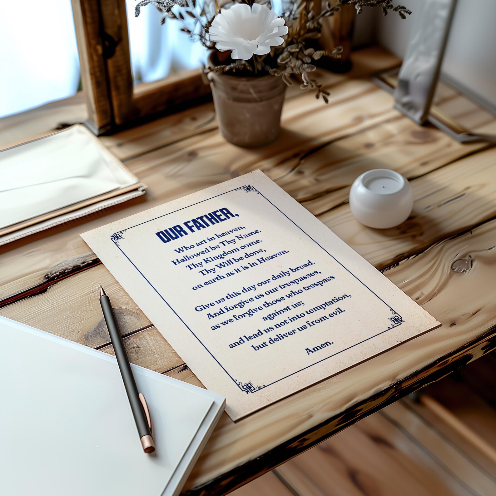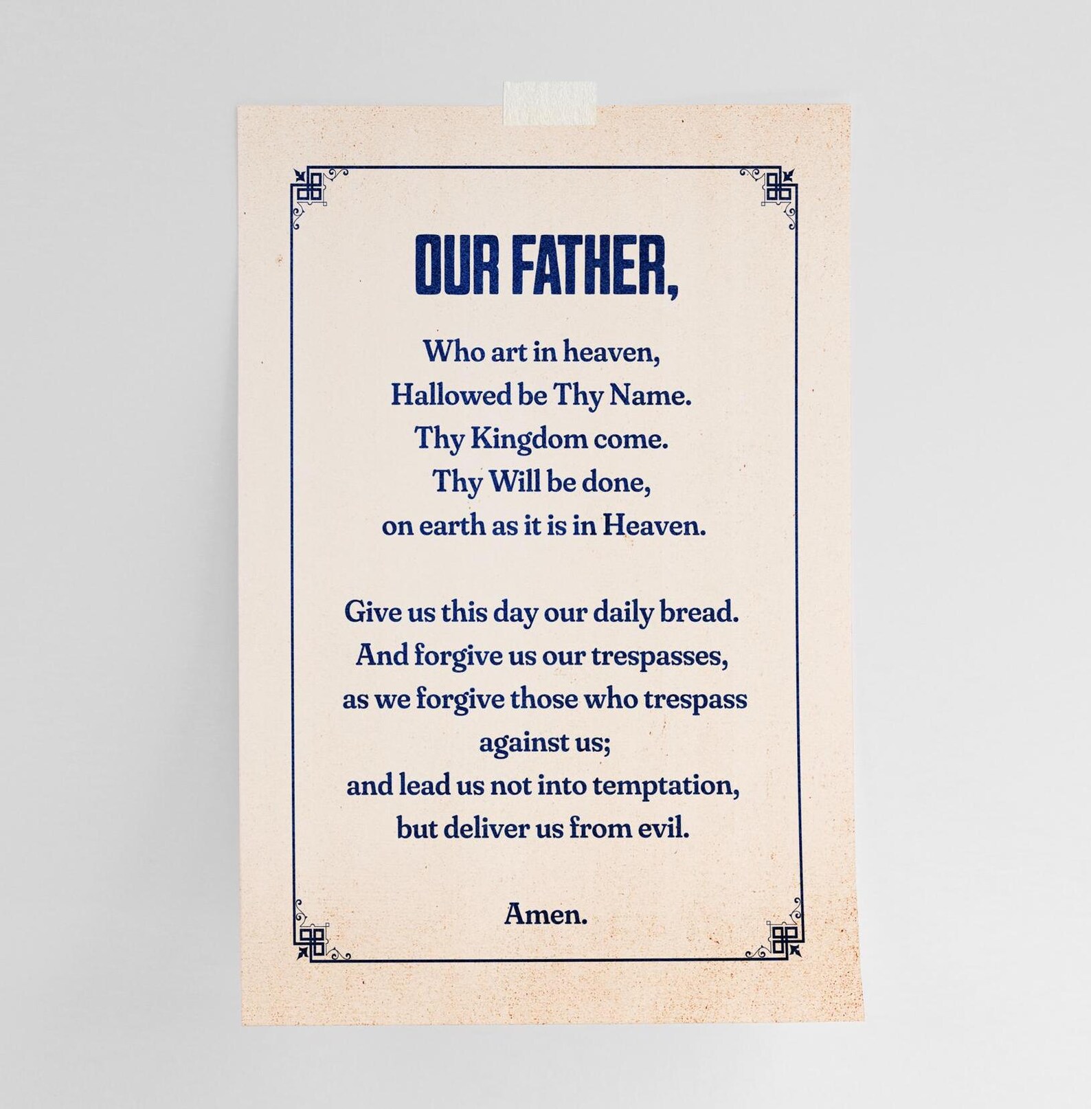 ✐ Este póster de papel antiguo, disponible en varias proporciones y tamaños, presenta la oración cristiana por excelencia: el Padre Nuestro. Decora tu habitación favorita con este elegante homenaje a la oración que Jesús nos enseñó.