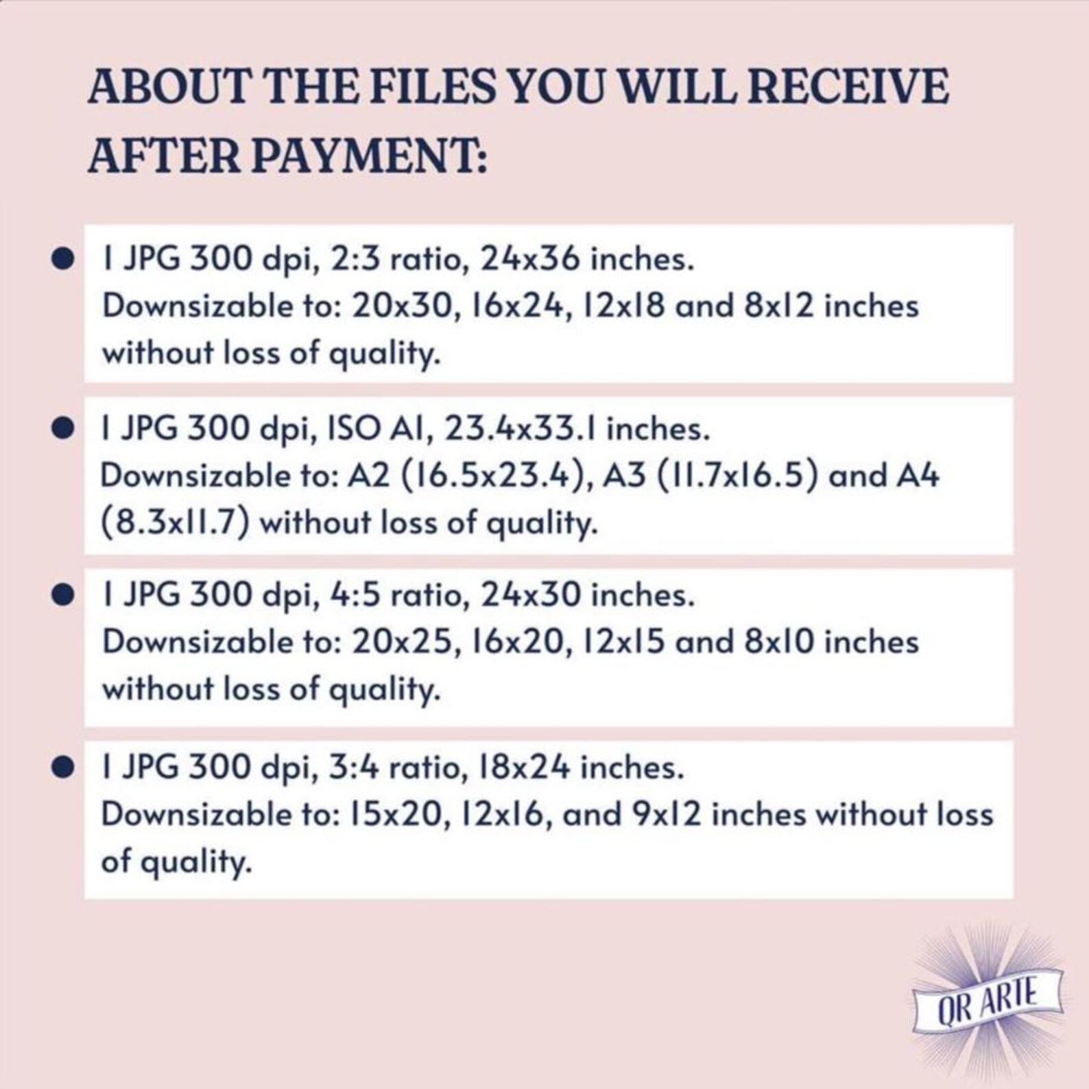 Después de realizar su pago, tendrá acceso a archivos JPG de alta calidad (300 dpi).