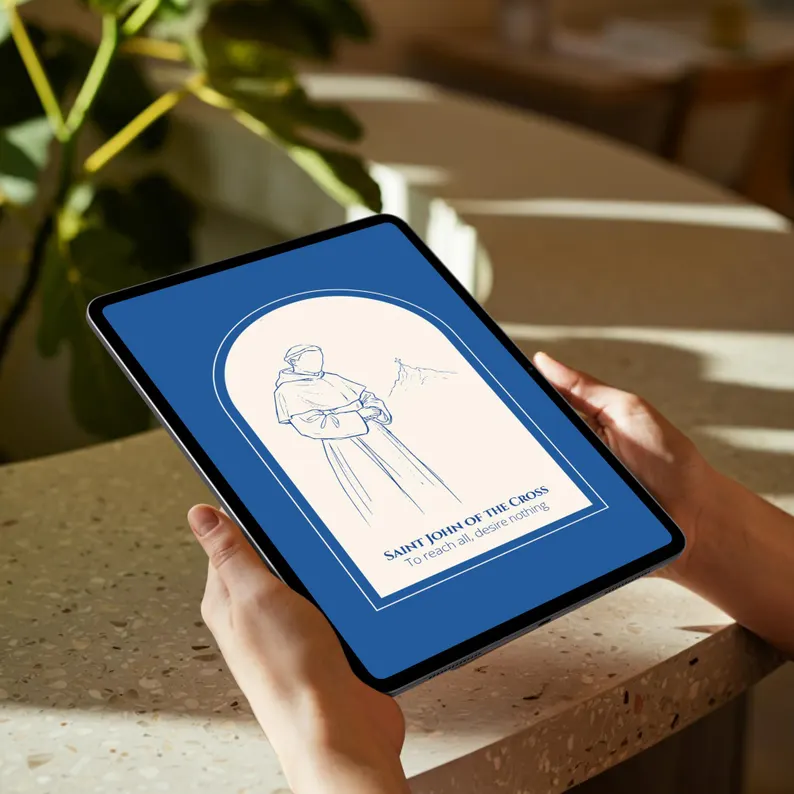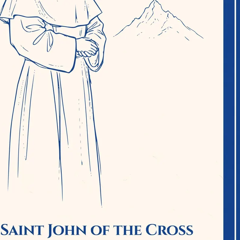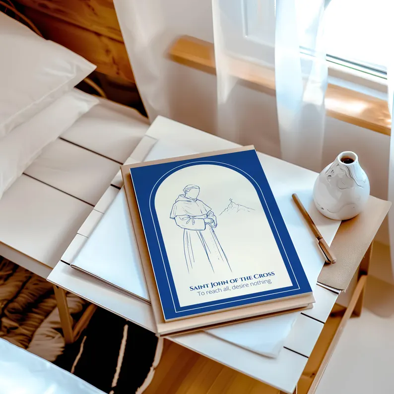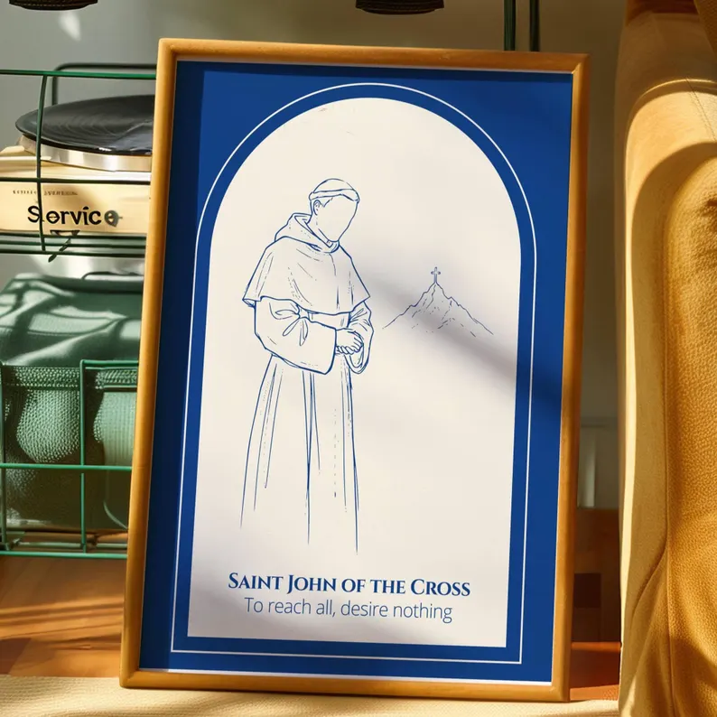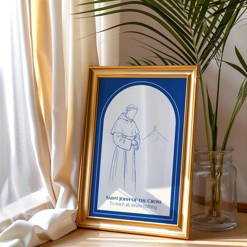 Esta lámina digital presenta una silueta de San Juan de la Cruz, Doctor de la Iglesia y maestro de teología mística, dibujada a mano con un estilo puro. El diseño se complementa a la perfección con su cita célebre: «Para alcanzarlo todo, no desees nada».