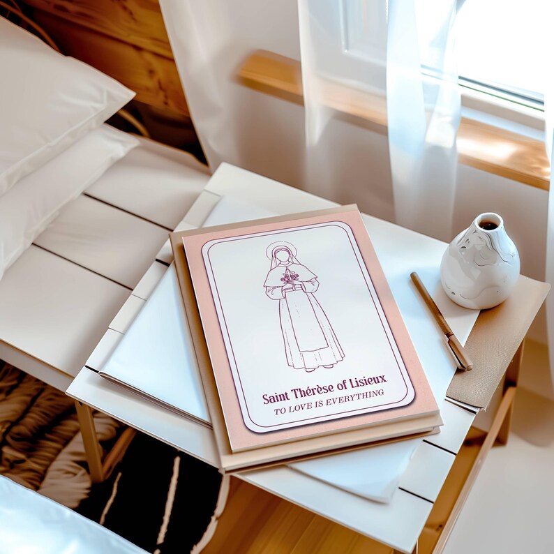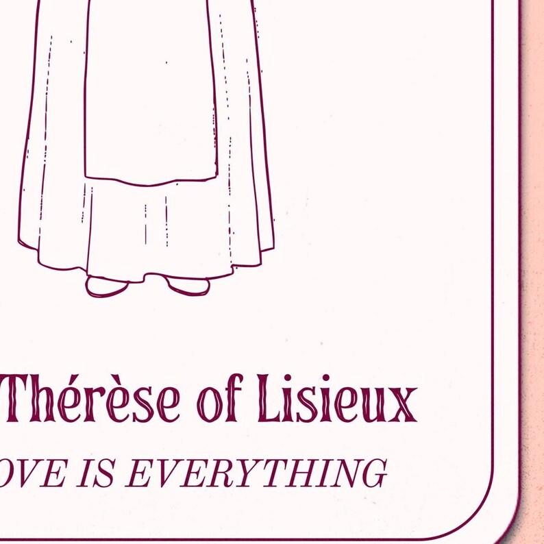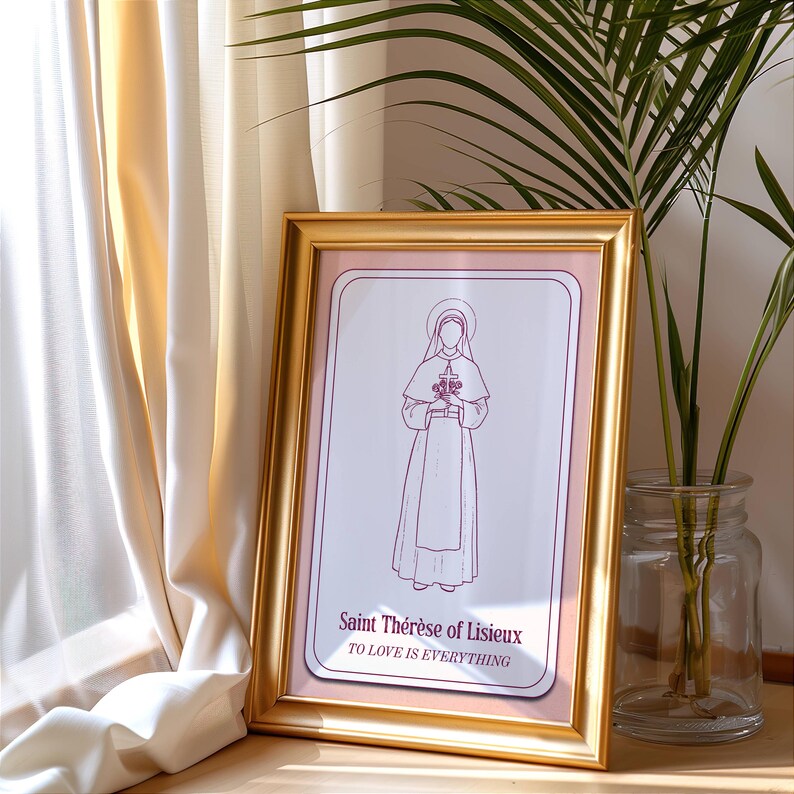 Esta lámina digital presenta una delicada silueta dibujada a mano de Santa Teresa de Lisieux, la Pequeña Flor. Se la representa con su hábito carmelita, encarnando su poderoso mensaje de encontrar la santidad en los pequeños actos de amor, perfectamente plasmado en la frase «Amar lo es todo».
