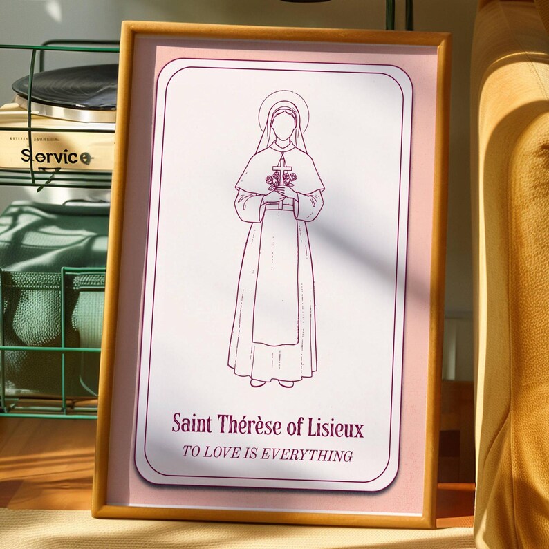 Santa Teresa, Doctora de la Iglesia, enseñó el «Pequeño Camino», haciendo hincapié en la plena confianza en Dios y en el amor como la vocación suprema. Este cartel representa su legado perdurable de sencillez espiritual, que resuena en las almas que buscan paz y gracia en los momentos cotidianos de la vida.