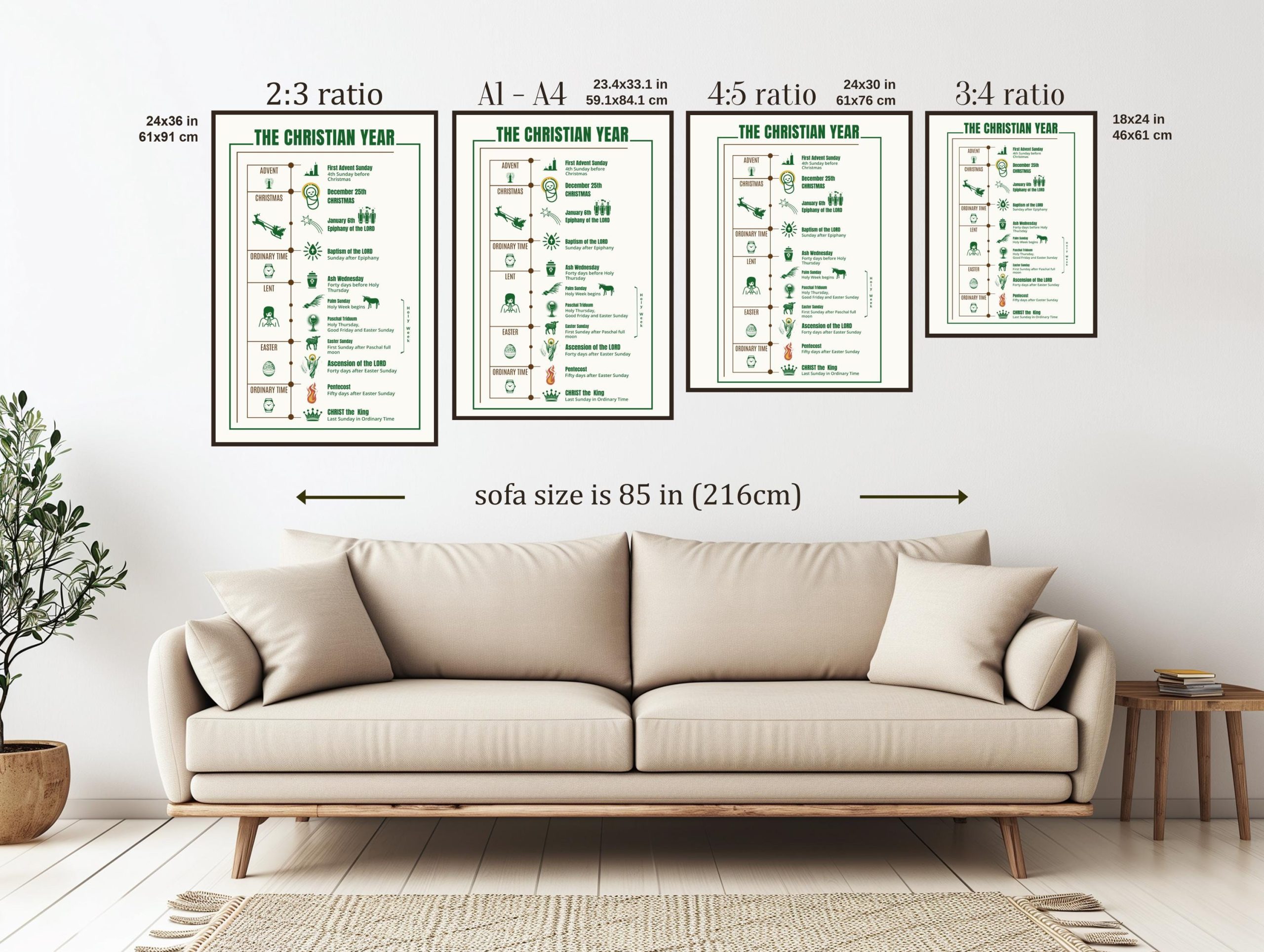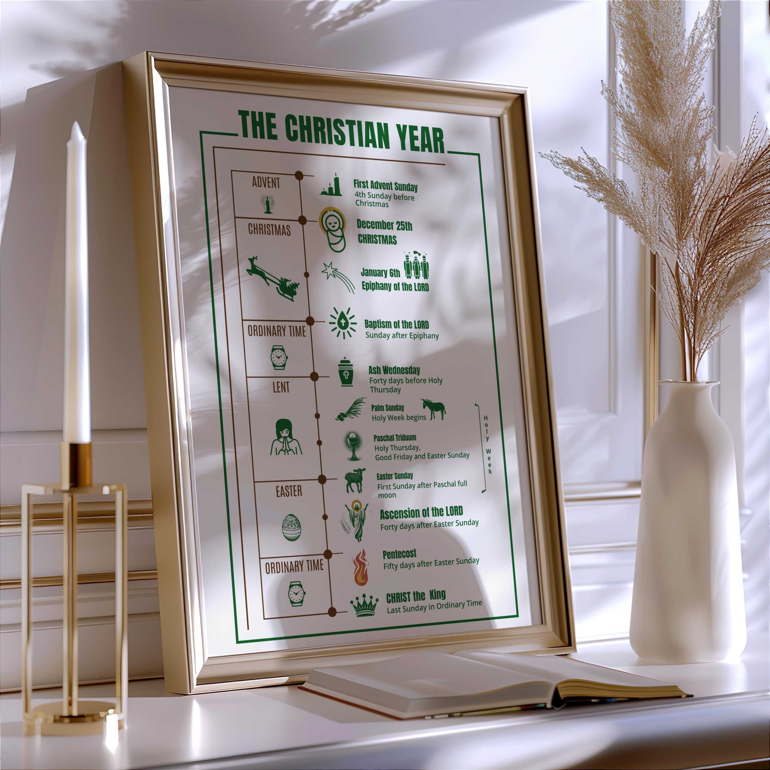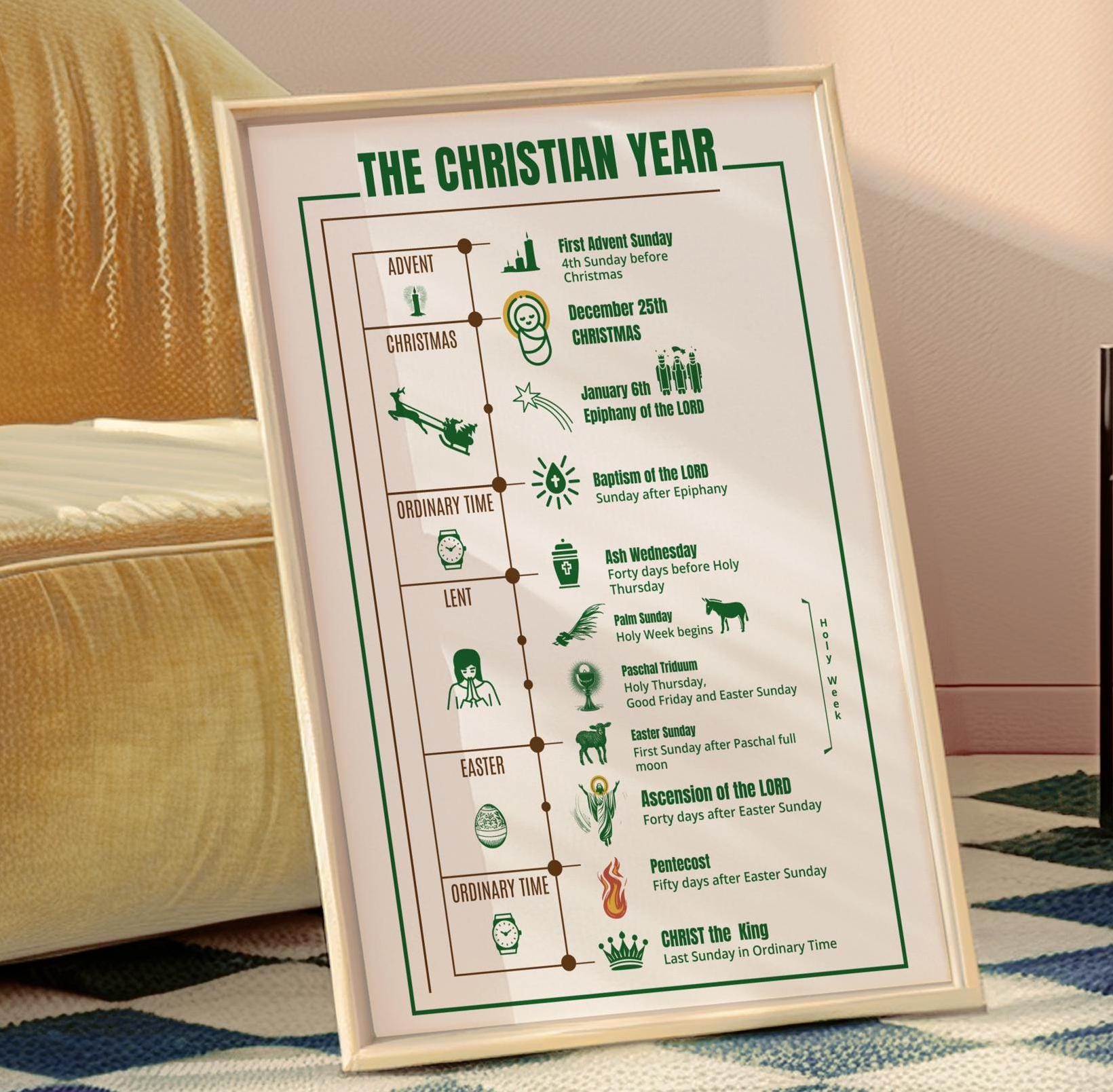 Resumen del año cristiano con sus festividades y momentos importantes en formato póster. Decora tu hogar, escuela o parroquia con esta hermosa y educativa obra de arte mural.
