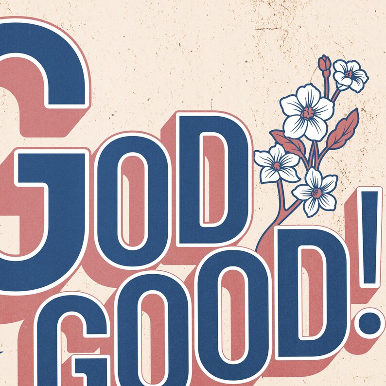 ✐ Póster cristiano cuadrado en estilo logotipo vintage con la frase «Dios es bueno» decorado con una flor.