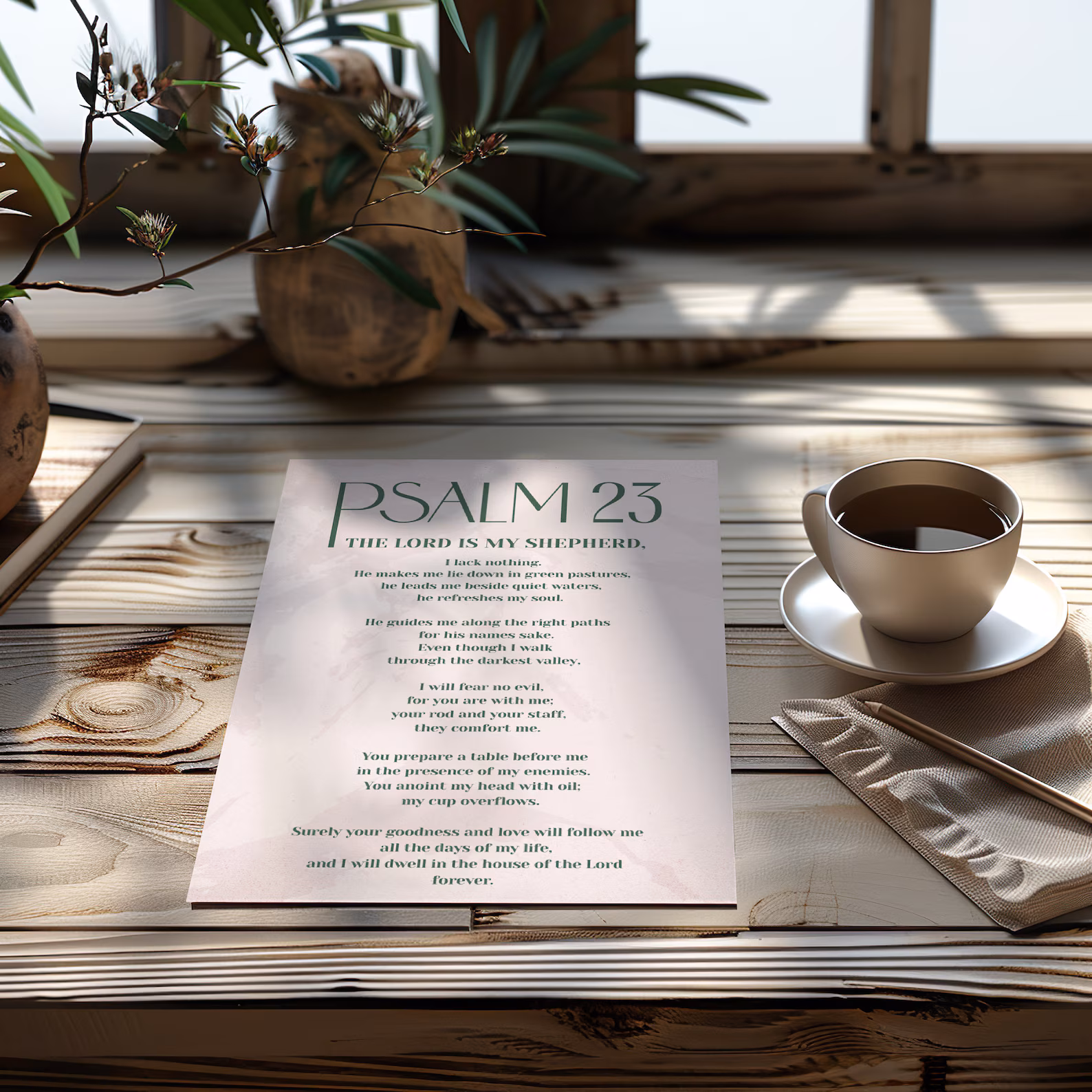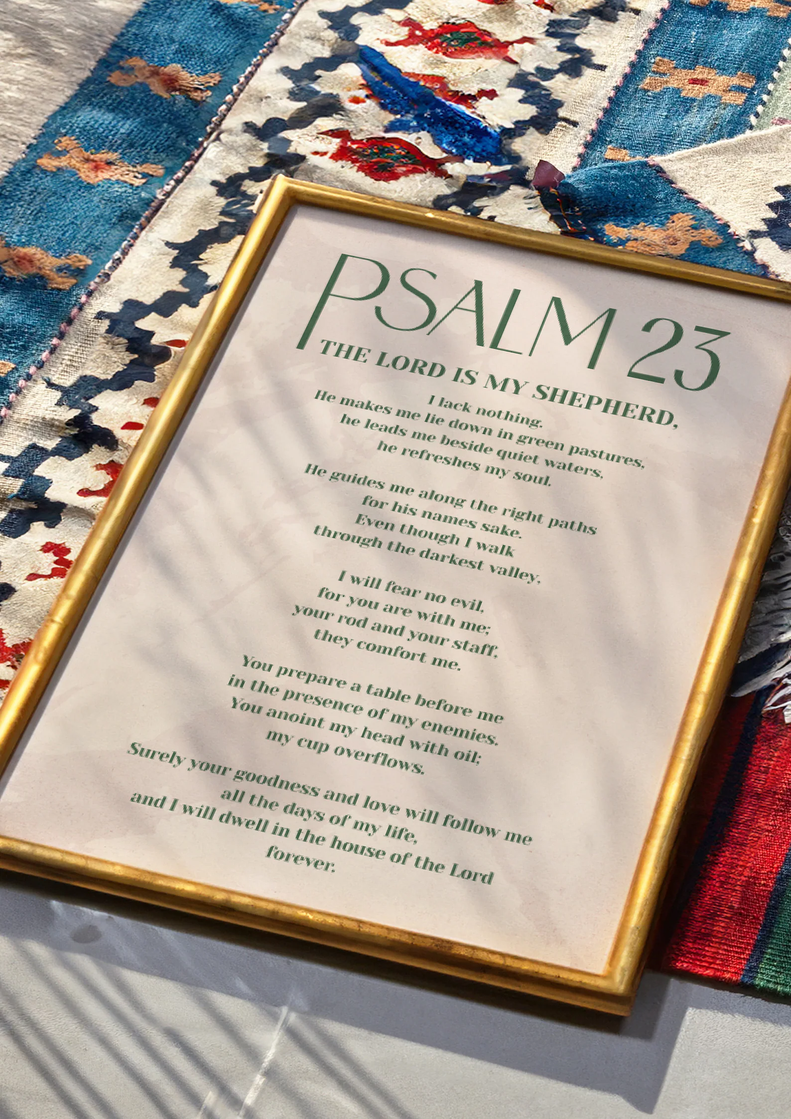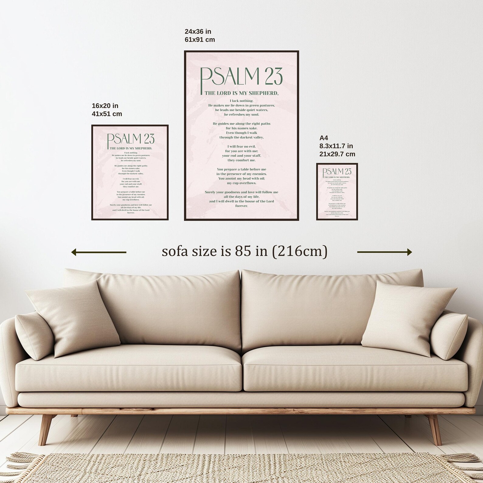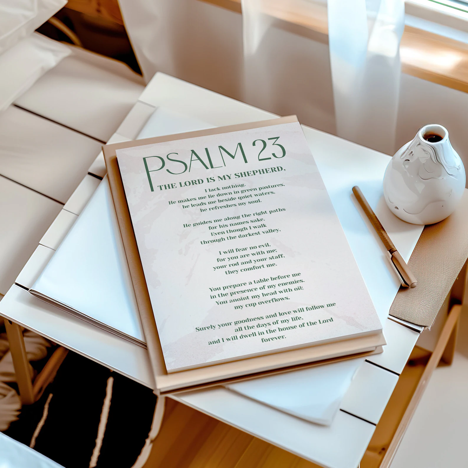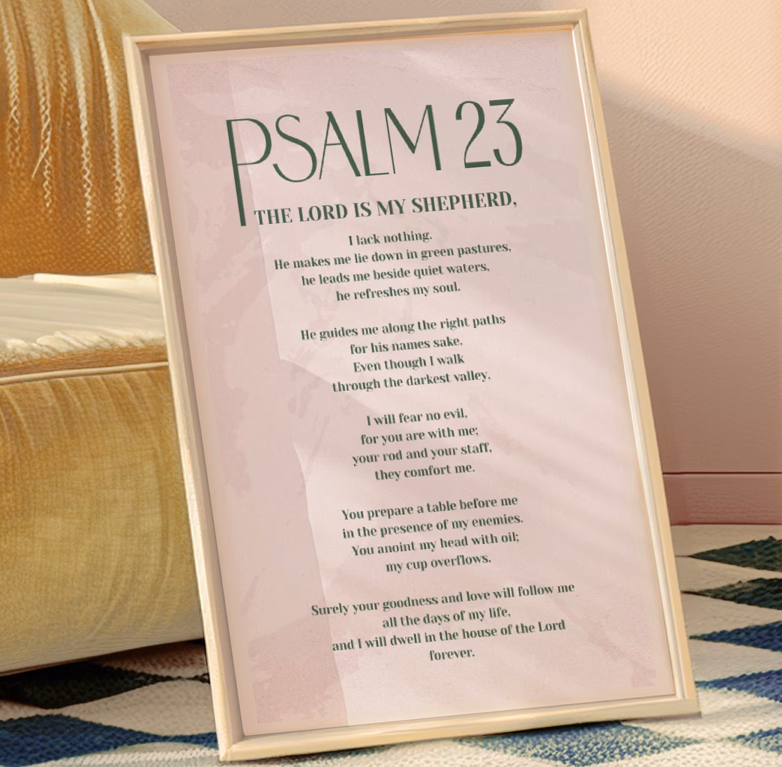 Póster imprimible con el texto del hermoso Salmo de David número 23. Decora tu habitación favorita con una de las citas más hermosas de las Escrituras: «El Señor es mi pastor». ¡Tres tamaños diferentes!