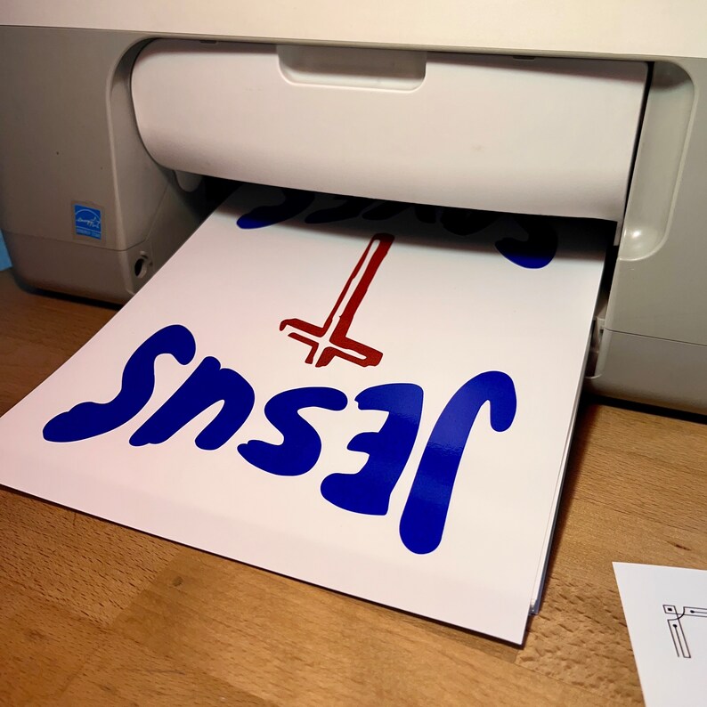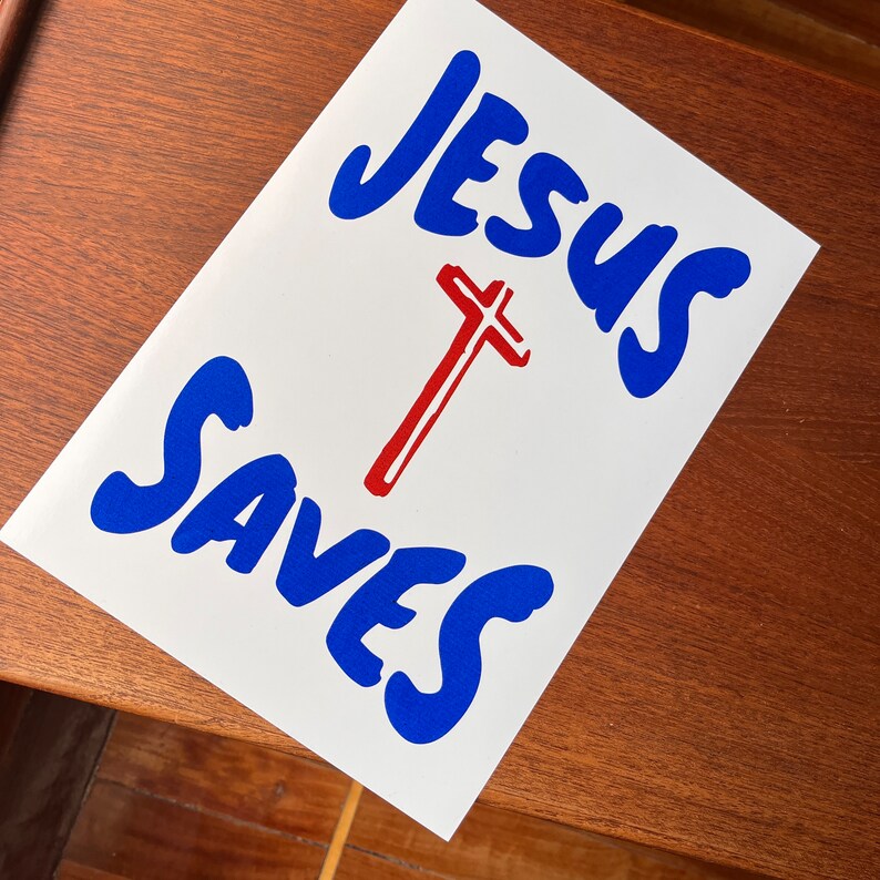☀︎ Póster con la frase «Jesús salva» en tinta azul sobre fondo blanco y una cruz roja. Vive y proclama tu fe a tu manera con una estética cristiana moderna y minimalista.